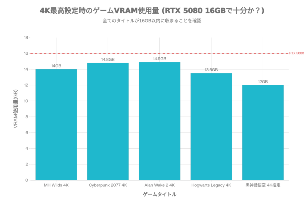 4K解像度の最高設定であっても、NVIDIAがRTX 5080に設定した標準容量(16GB)で十分なパフォーマンスを発揮するよう設計されています。AI処理とは異なり、ゲームではVRAM容量だけを増やしても、GPUコアの演算性能が変わらなければフレームレートの劇的な向上は見込めません。
