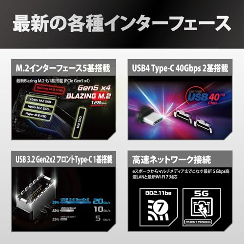 最大の魅力は、X870モデルが抱えるUSB4とM.2スロットの複雑な排他仕様から完全に解放されている点で、CPU直結のPCIe5.0 M.2スロット2基を制約なく最大性能で利用可能。