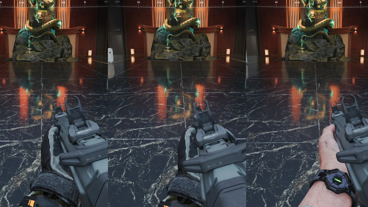 一方、NVIDIA DLSS Ray Reconstructionも反射にわずかな「波打ち」を示すが、それは 微妙なレベルに留まる 。対照的に、AMDの場合は 目立つ不安定さにまでエスカレートする ことが多い。