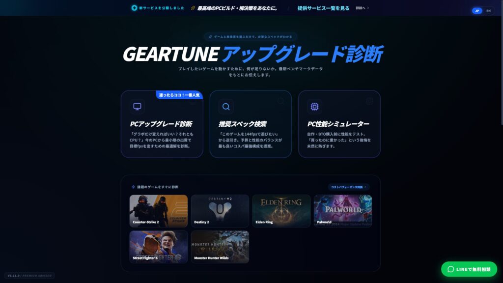 現在のPC構成とプレイしたいゲームを入力するだけで、システムに潜むボトルネックを瞬時に計算・可視化します。