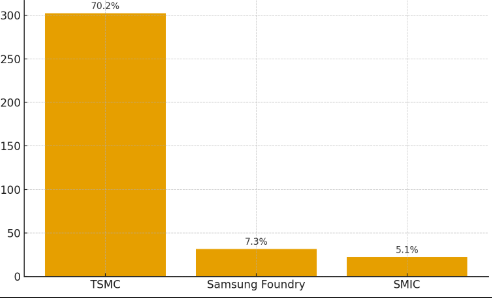 一方、2位のSamsung Foundryは31.6億ドル(7.3%シェア)、3位の中国SMICは22.1億ドル(5.1%シェア)に過ぎない。TSMCと2位Samsungの差は約63ポイント—これは「競合」と呼ぶには程遠い、圧倒的な格差である。